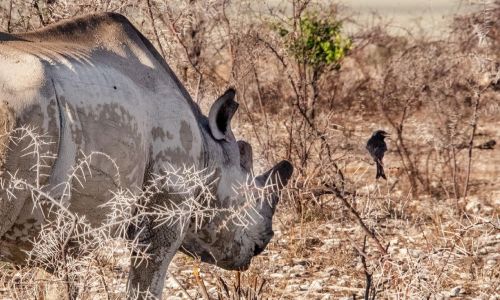 Wonder what they are talking about? The black rhino and the fork-tailed drongo. #namibia #blackrhino #forktaileddrongo #desert #etosha #pentax #penta…